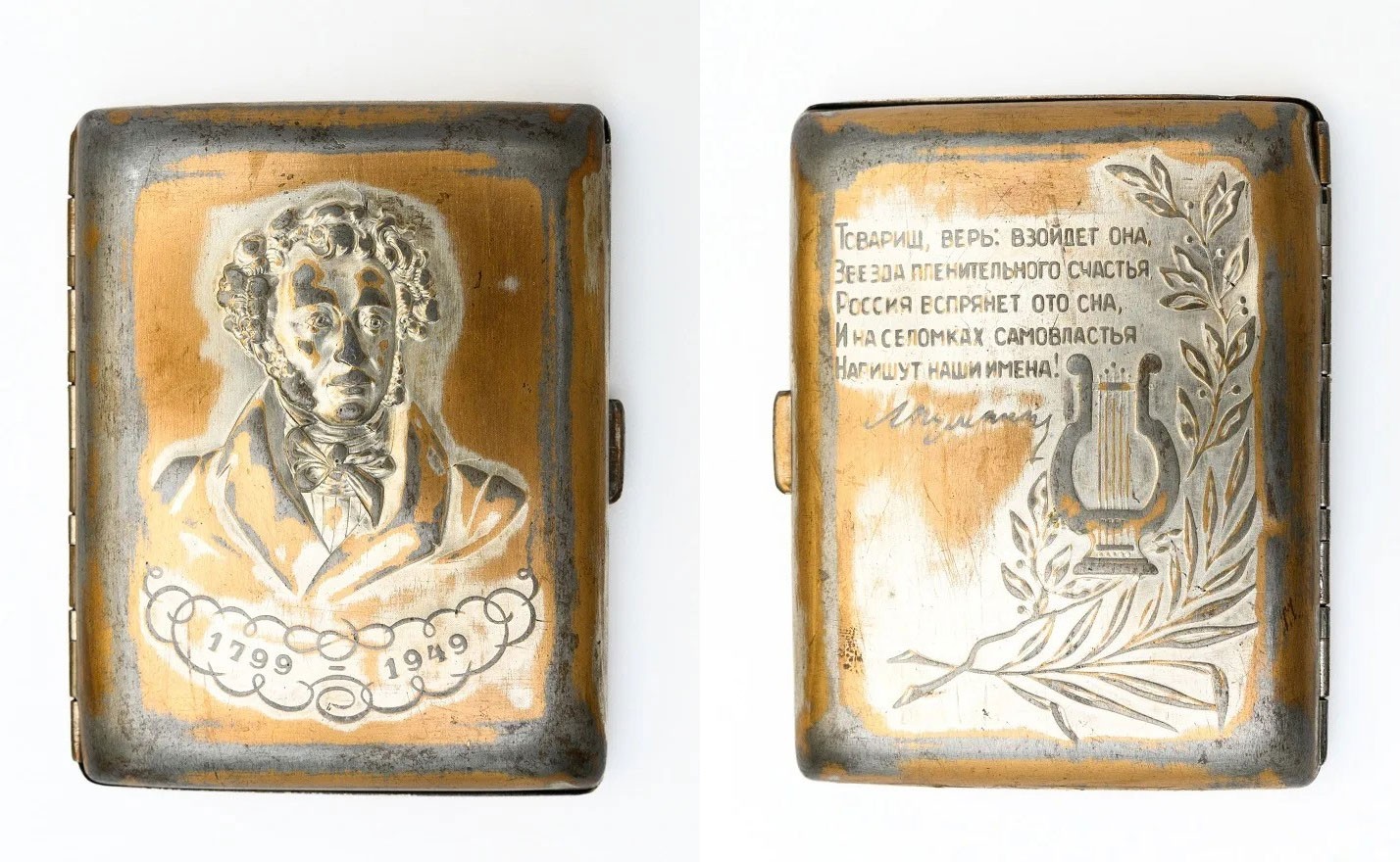 Портсигар с портретом Александра Сергеевича Пушкина, выпущенный к к 150-летнему юбилею великого поэта на заводе «Ленэмальер». Источник