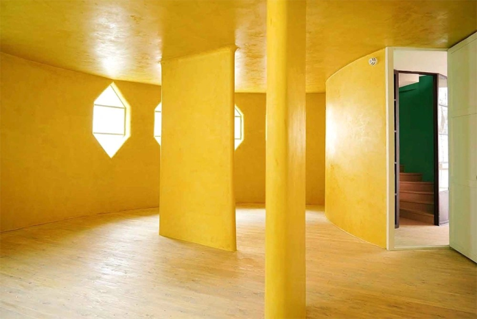 Композиция дома представляет собой два разновысоких цилиндра одинакового диаметра, врезанных друг в друга на треть радиуса и образующих тем самым необычную форму в виде восьмерки.