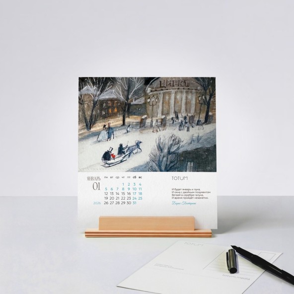 На его страницах 12 детальных иллюстраций — от заснеженных январских улиц, где кучер с важным пассажиром погоняет лошадь, до золотистой романтики октября, когда ты спешишь с бабушкой на электричку. В каждую иллюстрацию будто погружаешься и ежедневно находишь вдохновение, узнаешь себя и сохраняешь воспоминания о важном.